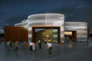 展馆形似一个呈波浪般起伏的水晶杯,又有大海中航船的意象。在造型复杂的钢结构和玻璃墙之外,覆有特制的钢丝网,加上大面积的屋顶花园,可起到遮阳节能的作用。